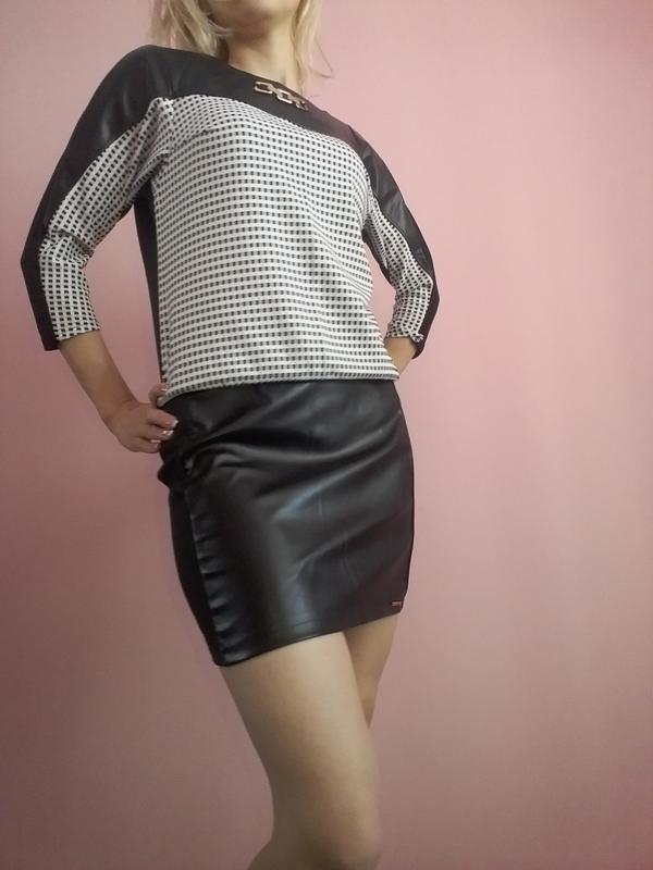 Платье с эффектом 2в1. Низ в обтяжку, вверх свободного кроя. Рукава три четверти летучая мышь. Состав ткани смешанный: юбка из дайвинга с вставкой из кожзама. Дефектов нет.
