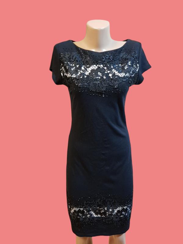 Черное трикотажное платье с камушками и ажурной вышивкой. Размер М.Полуобхват груди/талии/бедрах: 41/36/41см Тянется Общая длина 92см.