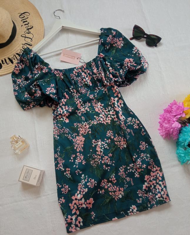 Короткое платье с вырезом каре и пышными рукавами. платье зеленое в цветочек