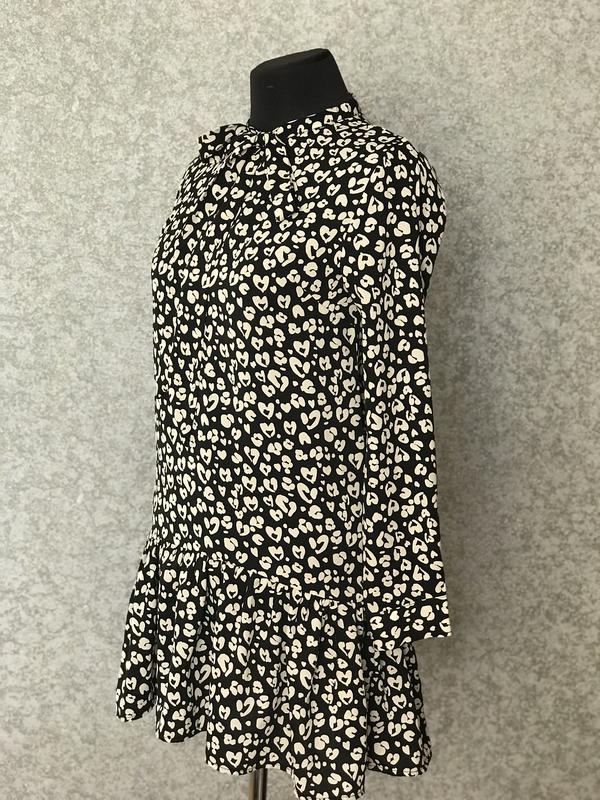 Стильное платье с бантиком на шее с абстрактным визырьком сердечки, подойдет на размер С Параметры: Длина - спереди 80, с уда - 86 см Плечи - 37,5 см ПОГ - 46 см Резинка (полу обхват ) - 48 см