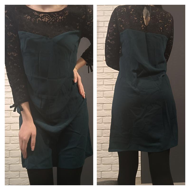 Плаття вільного крою з мереживом від Camaieu. Розмір S-M. Насичений зелений колір. Якісне мереживо, на якому не з'являються затяжки. Груди 46 см, талія 49 см, ширина знизу 57 см, довжина 88 см, рукав від плеча 47 см. Стан ідеальний.