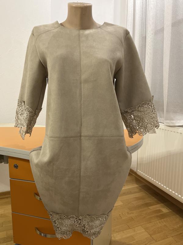 Стильное женское платье,длина -выше колена,спереди-материал-спандекс,спинка -тонкий трикотаж,рукава и низ спереди украшены кружевом,про-во ,Италия,46