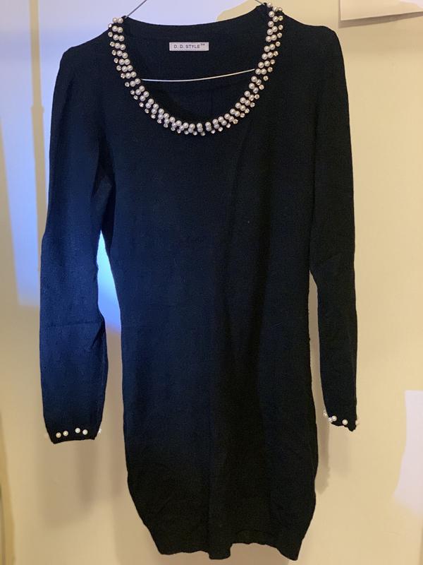 Сукня чорного кольору оздоблена перлинками і стразами . Матеріал дуже приємний . Красиво лягає по фігурі .