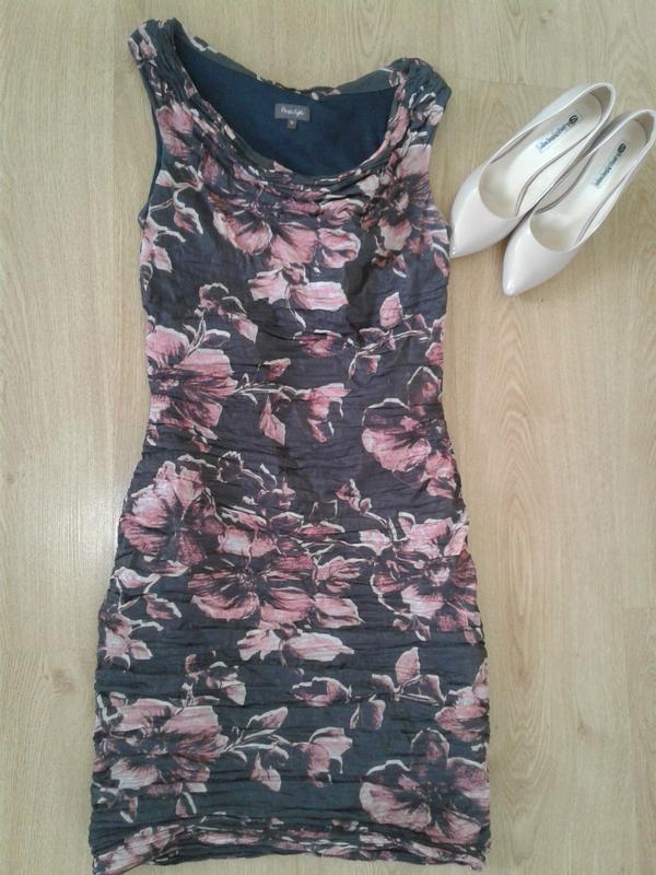 Стильное платье,стрейчевое,ткань как с банта,смотриться нарядно.По груди 46см,По талии 36см,По бедер 47см,длина89см