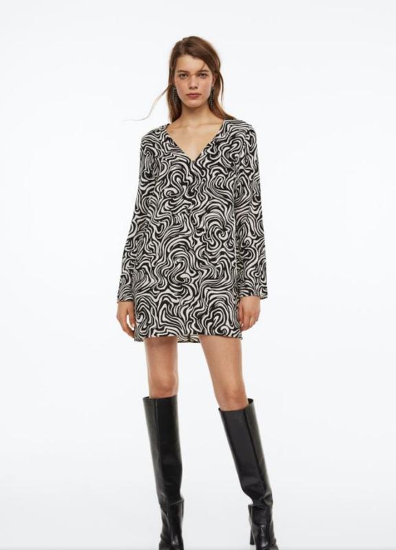 Короткое платье с длинными рукавами фирмы H&M, V-образный вырез, прямой низ по краю. Без подкладки. Оригинальный, новый, с биркой,размер М.