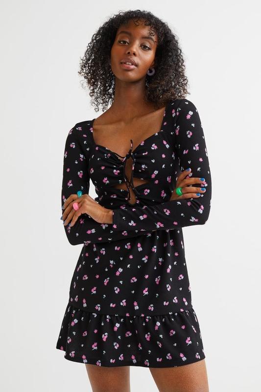Платье женское H&M, цвет черный😍 Размер XS Размер S❌продано❌ Плечи - 32см Груди - 36см Талия - 33см Длина - 82см Рукав - 61см Короткое и романтичное креповое платье с актуальным цветочным принтом в этом сезоне из мягкой ткани с вырезом в виде сердечка и шнуровкой спереди. Длинный рукав, собранный шов на талии и широкий волан внизу. Скрытая боковая молния. Без подкладки🔥 Цена 750 грн🔥🔥🔥