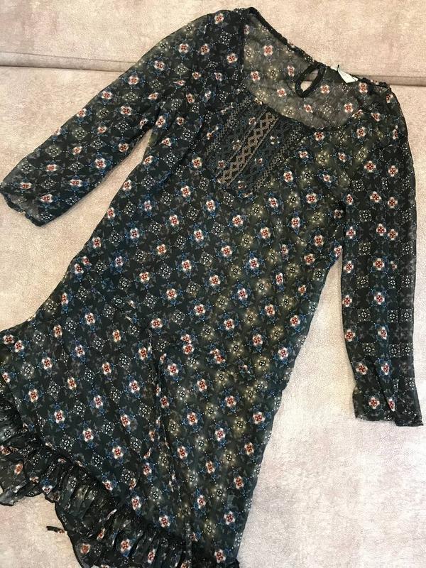 Платье подходит в качестве парео или сверху черного платья. Просвечивается. По низу присутствуют рюши, и пояс затягивается завязками. Не тянется. Рич секонд Замеры: длина 80 пог 48 пот 47 поб 50 плечи 39 рукав 41