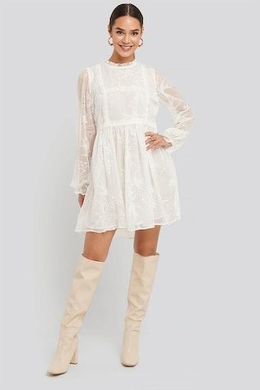 Платье с вышивкой NA-KD Эта мини-платье имеет воротник-стойку с оборками, цветочную вышивку по всей поверхности, струящийся крой, длинные рукава и застежку на пуговице сзади. Цвет - белый Состав 100% полиэстер Размер 36 Цена 650 грн По запросу реальные фото и замеры