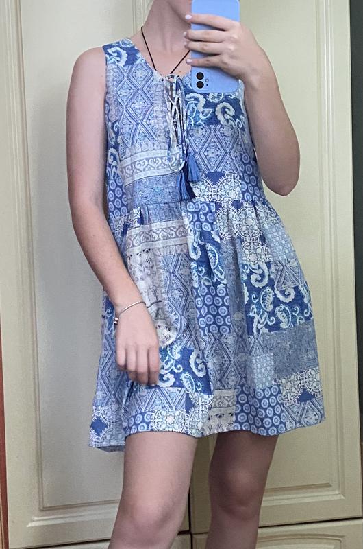 Плаття гарний фасон, на грудях регулюються зав’язки, ззаді зачіпається на гудзик зверху 10/10