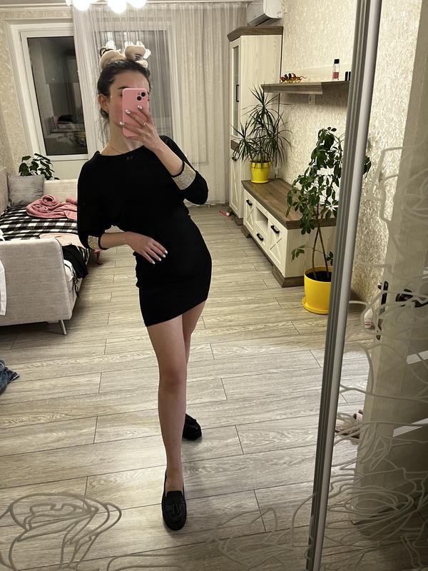 Маленькое черное платье с камушками на рукавах. Ткань тянется и подходит на сезон зима-весна. Классно будет смотреться под высокие сапоги и черные колготки. Платье будто минималистичное, но в то же время очень празднично. Универсальная вещь, которую можно надеть на любое мероприятие.