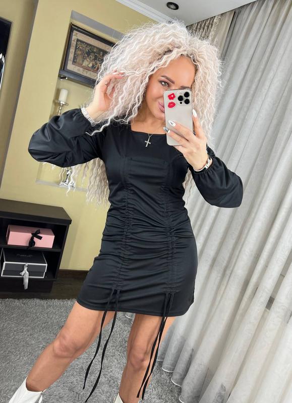 Новинки Платье мини однотонное на затяжках •Окраска: черный, беж •Размеры м 42/44(2) и л 44/46 (3) Длина 82 (можно регулировать) Рукав 65 М (2 ) пог 42+ Л (3) пог 45+ нольделяттричетырешим-симтришнул восемью