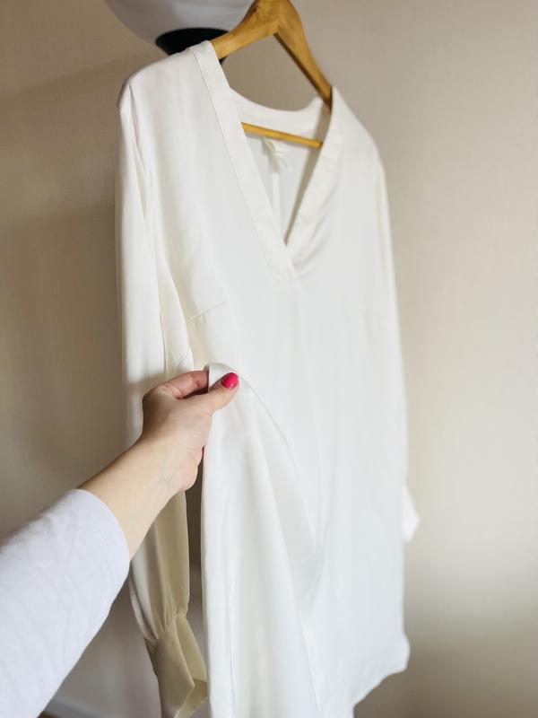Класне, типу атласне плаття від H&M 🕊 Дуже круте на літо, не обтягує, сідає вільно. Гарно ‘струїться’ та переливається. Дуже красива тканина! Поліестер. Розмір пише Л. Заміри: довжина 81, ПОГ 67, рукав 61.