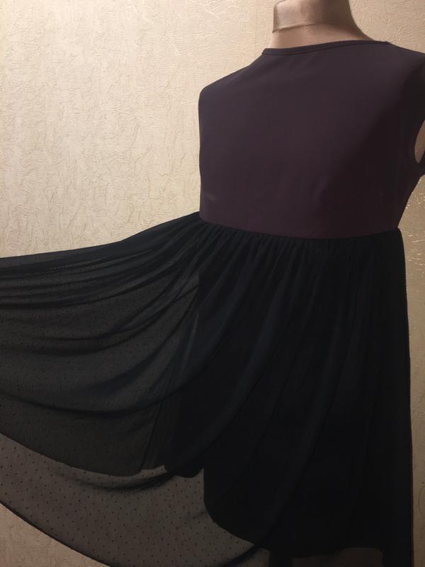 Красива сукня, глибокого чорнильного кольору, шов під грудьми, від шва зверху друга спідниця (верхня) з фатина чорного кольору в дрібний горошок. за розміром.Красиво виглядає під чорні ботфорди,чоботи,туфлі. Розмір 48.Якщо потрібні виміри, зроблю.