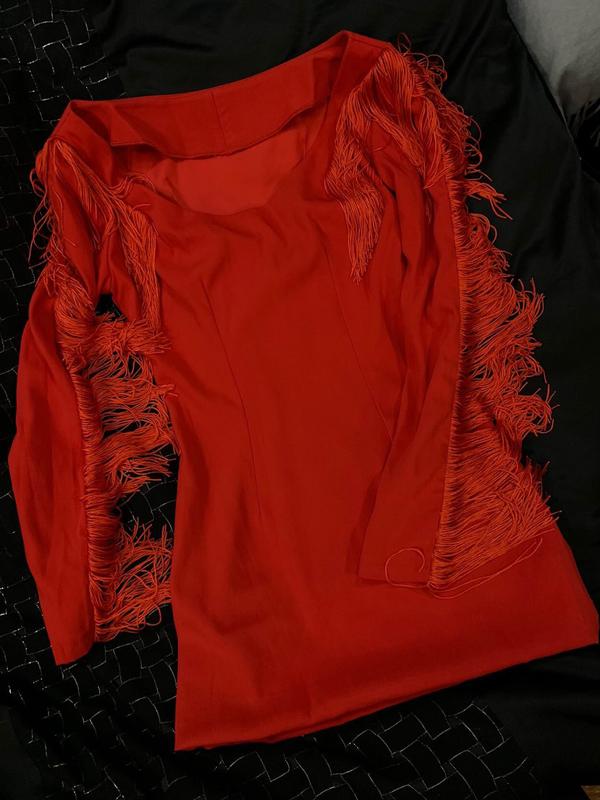 Червоне коротке плаття нове ( одягалось 1 раз для зйомки ) з цікавими рукавами ( базркмп зроблена із шовкових волокон ) розмір S . Спинка закрита . Замок схований , застібається на талії . Приталена сукня