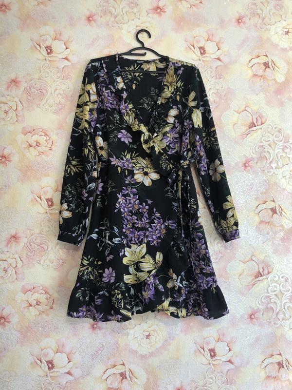 Гарненька сукня в квітках з довгим рукавом. Сукня на запах. Розмір S.