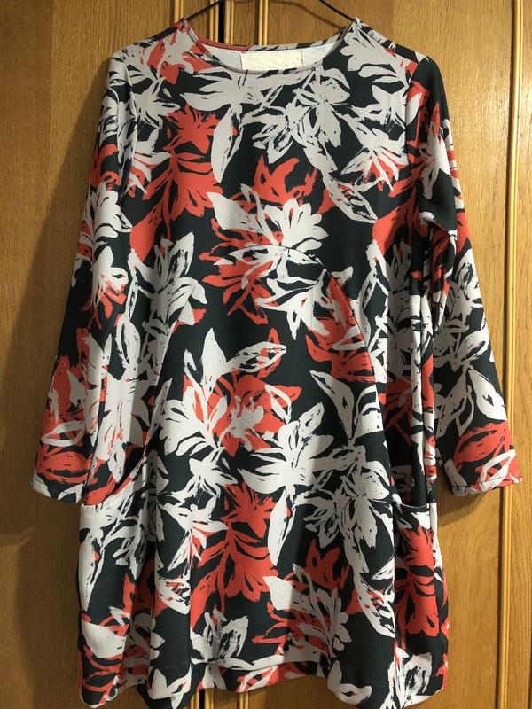 Очень интересного кроя платье, цвет основы фото не передает, оно темного насыщенного зеленого цвета с серым и краснокоралловым. Спереди на 2 см короче - 82, плечи 37 а по низу в виде оверсайз - полширины 66, рукав 55, ПОГ 50. Форма трапеции, ну очень классная)