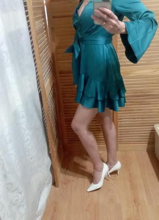 Сатиновое бирюзовое платье с кукольной юбочкой из воланов, длинным рукавчиком, в- образный вырез на запах