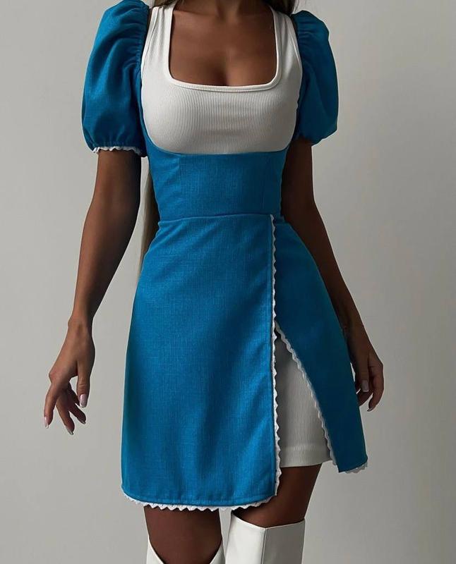 Тканина: Рубчик + льон Размер: 42-44, 44-46 Цвет: пудра, синий Состоит из двух изделий: универсальное платье рубчик молочного цвета и сарафан из льна с изысканным кружевом. #756