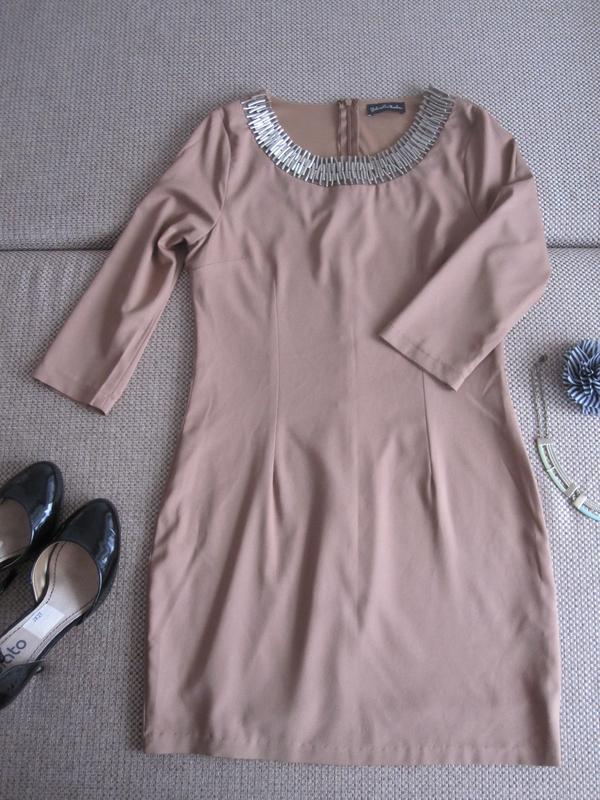 Стильное платье от Gabriella Rocha, США. Б/у отличного стана. На размер XS, S, бежевое платье (песочное) на подкладке, рукавчик 3/4, ориентировочно состав тканы ПЭ. Ткань слегка тянется средней плотности. Платье декорировано металлической окантовкой, сзади на молнии до пояса. Отличный вариант для особых событий. Замеры Ширина от подмышки до подмышки 44 см ПОТ 37 см ПОС 45 см Длина по спинке 82 см Ширина по плечиках 35 см Довжина рукава по верху 42 см Длина рукава по внутреннему шву 29 см