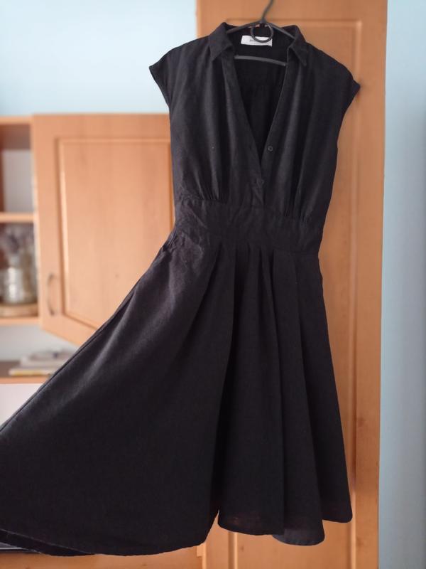 Платье темно -графитового, практически черного цвета с v-образным вырезом и воротничком. Ткань-лен, на юбке есть подкладка, скорее полиэстр. Бирки со складом и размером срезанные. замеры: длина по спинке 92см, плечи-45, ПОГ- 42, ПОТ_34 см. есть поясок. Ответь на вопрос и сделай дополнительные замеры при необходимости) Разбираем гардероб 💃