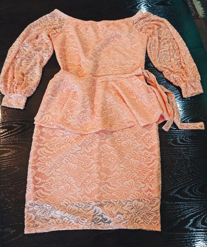 Сукня мереживна з баскою в ідеальному стані. Баска знімається. З відкритими плечима. Широкі рукава. Ззаду маленький розріз. З підкладкою. По бірці розмір 52, але фактично 50. Тягнеться.