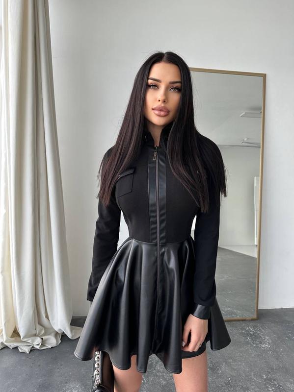 Сукня міні чорного кольору💣 Спереду акцентна блискавка, а розкльошена спідниця не сковує рухів. Така базова сукня легко поєднуються з високими чоботами або масивними трендовими човниками Розмір: S, M Розмір L під замовлення +200грн Матеріал: екошкіра та трикотаж