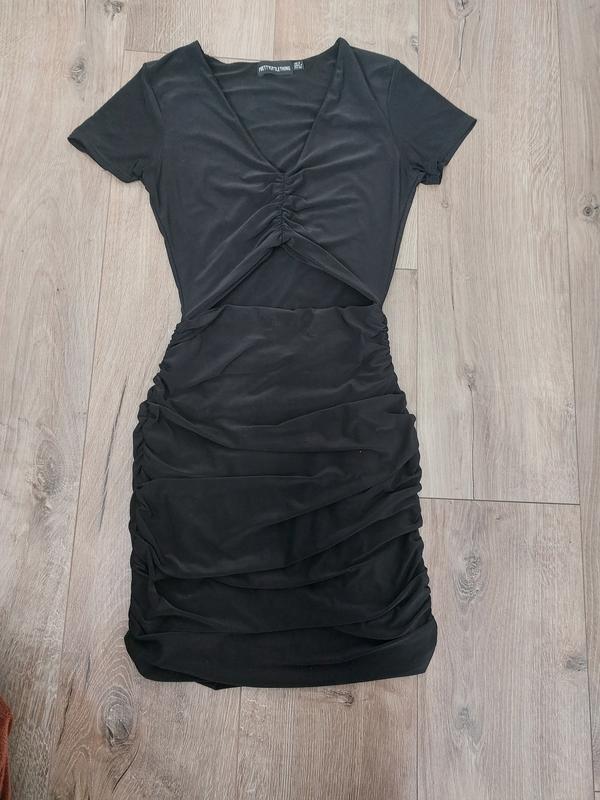 Женское платье, черного цвета, с неглубоким декольте, вырезом на животе, с короткими рукавами. Размер по сетке: Обхват грудей-84 см. Обхват талии-68 см. Обхват стегон- 94 см. Размер S(36)