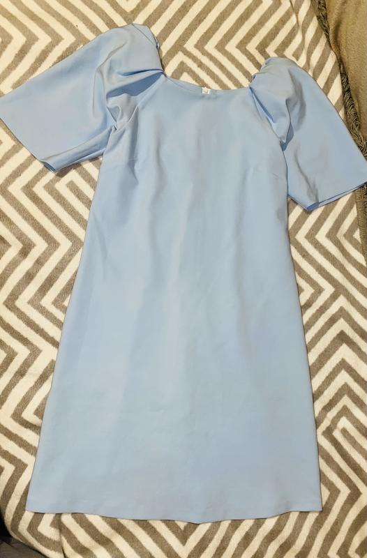 Небесно голубой цвет с карманами, на спинке замочек, пышные рукава,купленная в Италии зимой по снижению при 40 евро ( 1600 грн ) одета раз