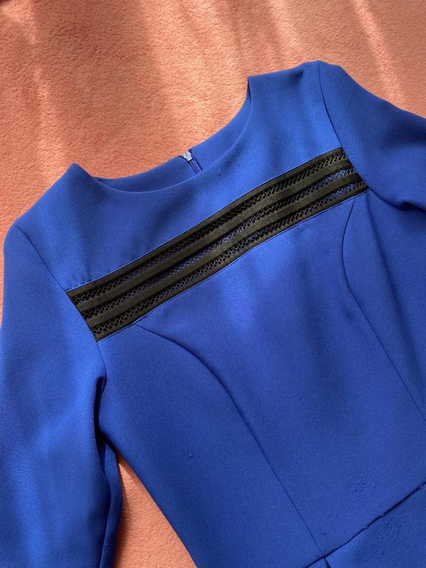 Насиченого синього кольору, є пасочок під який можна носити сукню, дуже гарно виділяє талію, ззаді на замку