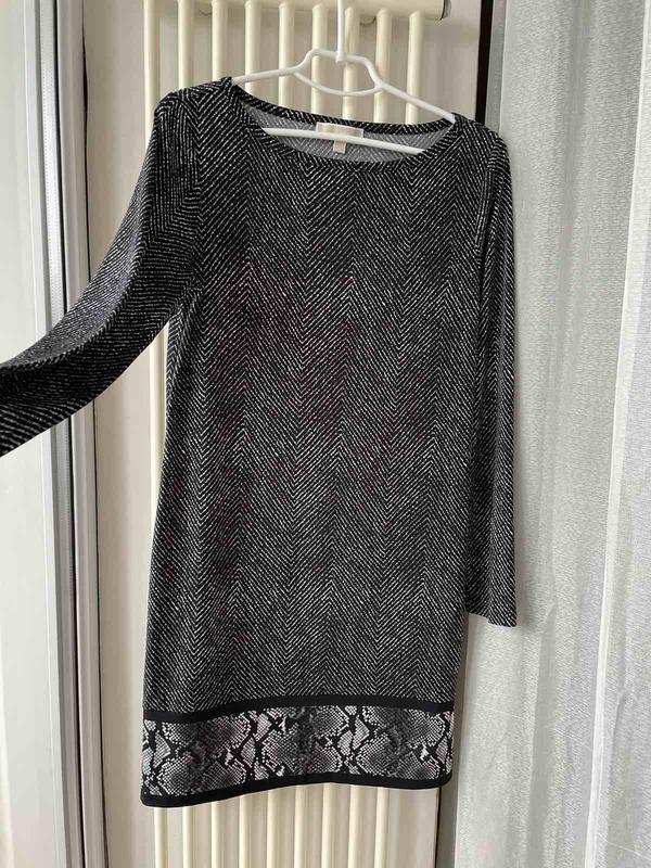 Платье- туника в красивом состоянии Еластична, трохи тягнется Цвет черно/белый Снизу декорирован змеиным принтом Подмышки 45 см Плечи 37 см Длина рукава 60 см Длина 87 см Цена 450 грн