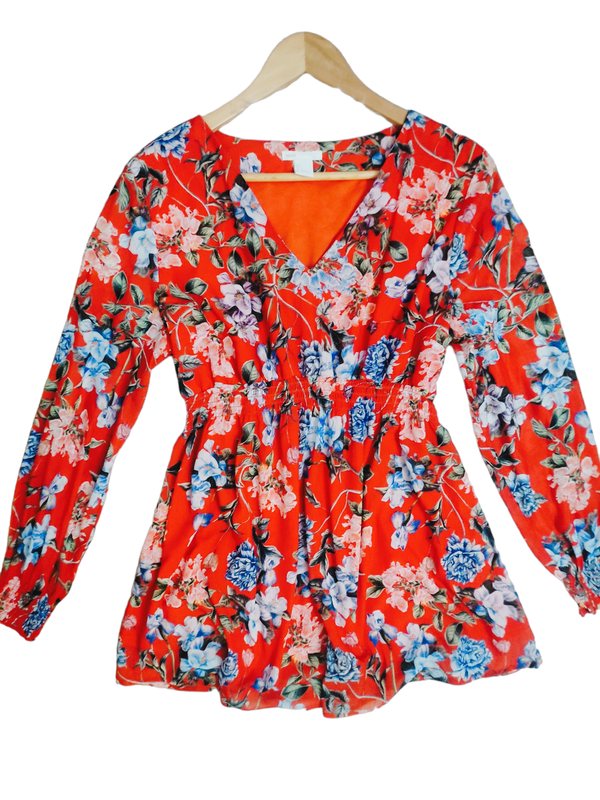 Платье с цветочным принтом и с V-образным вырезом из воздушной ткани с набивным рисунком. Собранный шов под грудью и длинные рукава со сборкой на манжетах. Частично на подкладке. Размер S Замеры:. рукав - 60 см высота - 76 см На наборе европейский L Стан идеален, без дефектов Отправка укр и новая почта