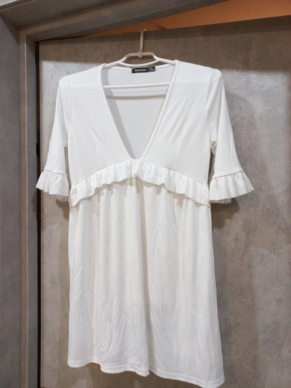 белое платье,стан не одевалась, как новое, белоснежное является заводской диффект на остановке фото по шву, легко исправить) размер s,m длина 78 в комоде 42 в стегнах 56 плечи 34 рукав 31