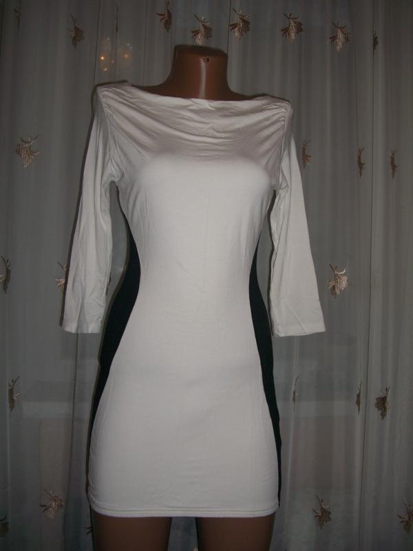 платье трикотажное белое, с двух сторон по бокам контрастные черные вставки, которые визуально подчеркивают фигуру, рукава 3/4, впереди закрытый верх, спинка немного открыта, длина выше колен
