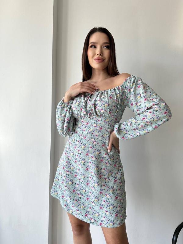 Новинка💘Вже в наявності Сукня мод aj 336 Тканина: Софт Розміри:42-44,44-46 Кольори: як на фото Фото реальні Романтична сукня міні у квітковий принт, на грудях куліска регулюється.Застібається на потайну молнію.