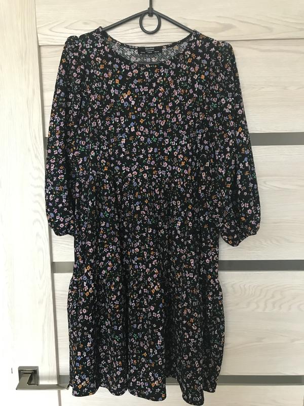 Платье с цветочным принтом. Свободного кроя. Размер S. Рукав 3/4 длина 48 см на резинке. Длина платья по спинке 85 см. Полиэстер 98%; эластан 1%