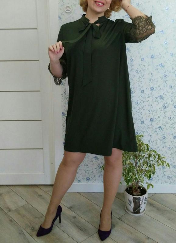 Платье всегда модного цвета хаки. Украшена французским кружевом. Свободный силуэт. Бант на шее - тренд этого сезона. Тканина софт. Длина 96 см Ширина в груди 60 см Ширина в бедрах 62 см