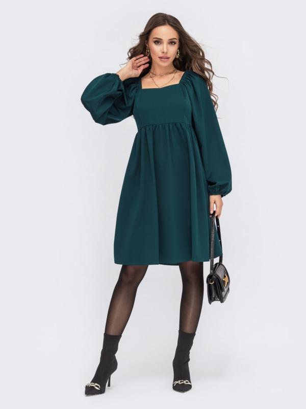 Темно-зеленое платье из костюмной ткани с завышенной линией талии.