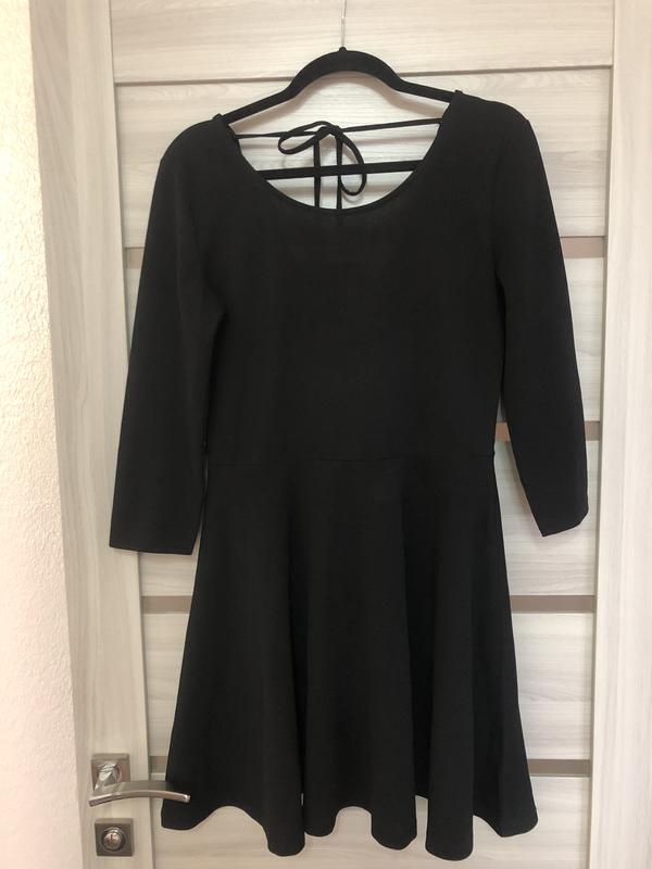 Черное мини платье с открытой спинкой на шнуровцв. Рукав 3/4. Юбка полусоциальная