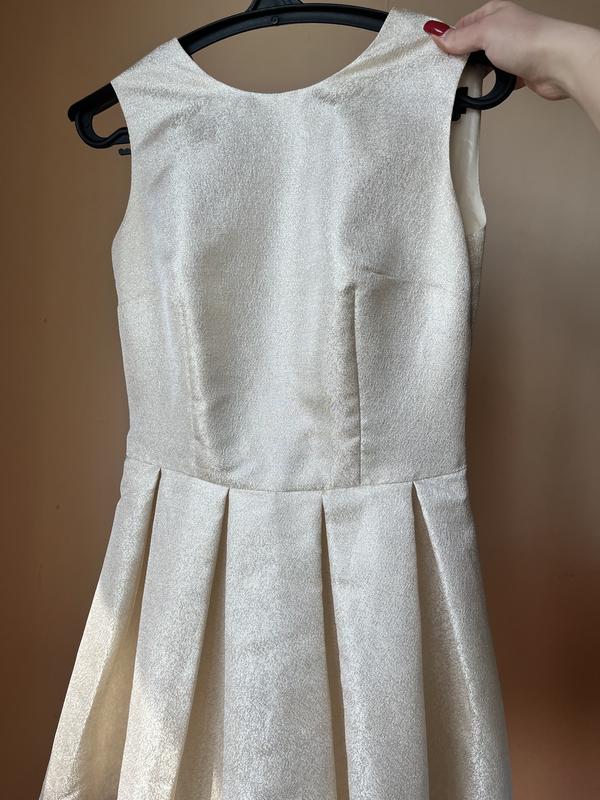 Роскошное платье золотистого цвета - идеальное состояние; - длина выше колен; - открытая спинка; - 36 размер на бирке; - сзади завязывается бант; - присутствуют карманы; - молния сбоку.