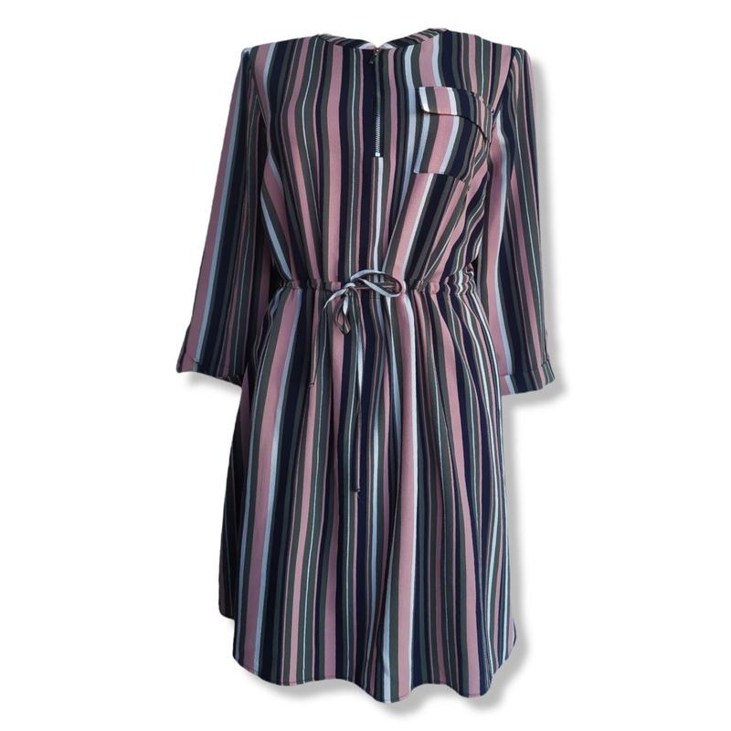 Стильное платье в полоску.Качество ткани хорошее,не просвечивается,легкая.Состояние отличное.Замеры:плечи-38; пог-54;поб-58; рукав-45;длинна от плеча-85