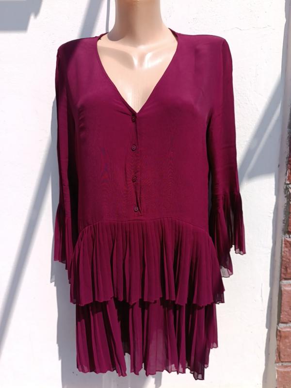 колirр свекольный (марсал), размнр М-L, рукава и низ из шифона, на тиле ткань плотнее замеры:плечи41,рукав51,груди53, талия 54, перед длина77, зад длина 93