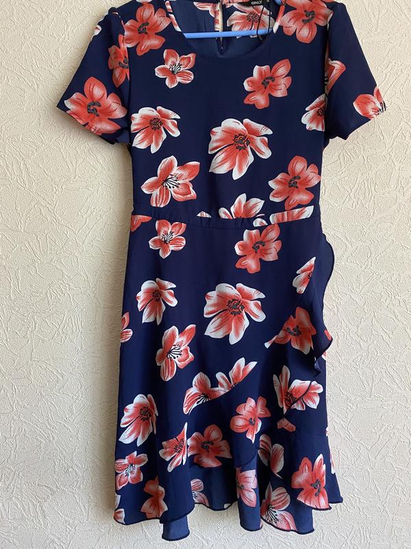 Платье Only синее в цветочный принт Сезон: лето Юбка на запах Одношарове На спинке защепляется на 1 пуговицу В талии (на спинке) на резинке Рукав короткий обычный