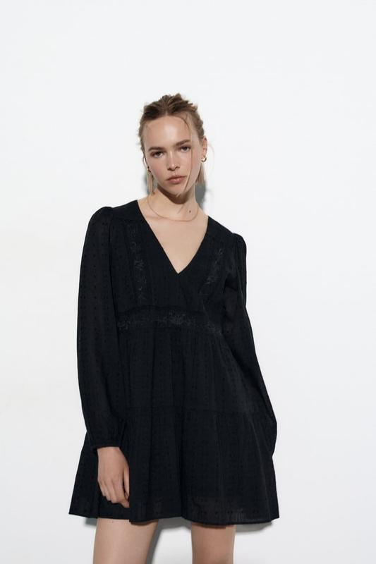 Коротка сукня з V-подібним вирізом і довгими рукавами з еластичною обробкою. Легка тканина, пишна спідничка, тканина прошви, з перфорацією. Чорний | 0881/209