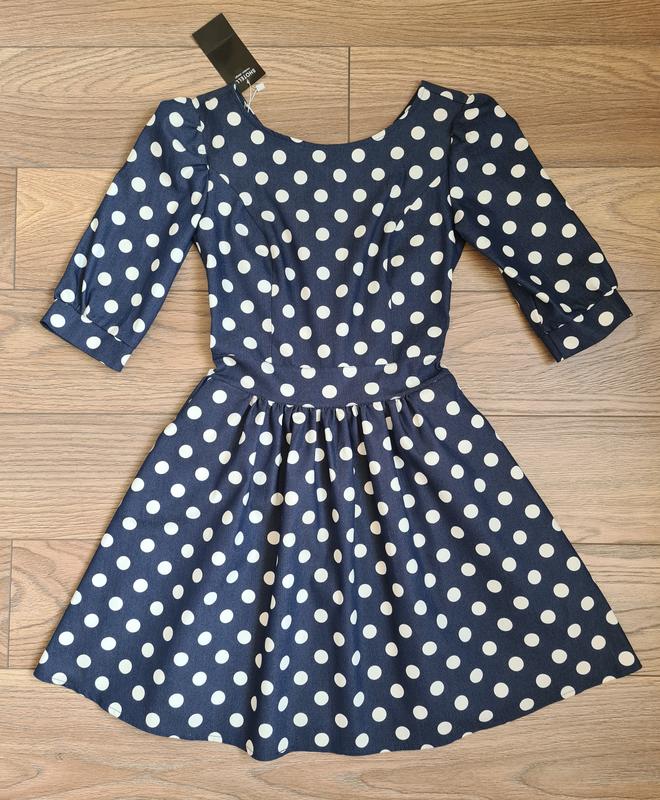 Очень красивое платье тёмно-синего цвета в белый горошек на девочку. Есть два карманчика, на спине молния. Ткань стрейч-катон. Размер 36 (объём по груди 78 см, объём по талии 61 см, плечо 6 см, длина рукава 36 см, длина юбки 42,5 см).