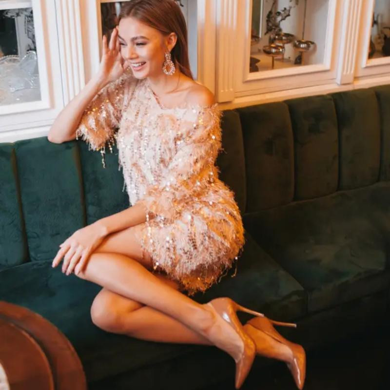 Короткое нюдовое платье декорировано пайетками с бахромой. Модель дополнена внутри телесный подклалом из ткани - масло. Размер: универсальный подойдет на S,M,L