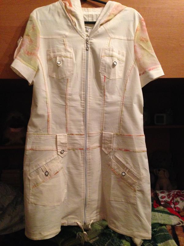 Літня молодіжна сукня. Плечі - 44, ПОГ - 54, ПОТ - 48, довжина - 89. Тканина щільна, схожа на плащівку, трішки розтягується, синтетика. Є невеликий дефект, його видно на фото: відсутність одного гудзика.