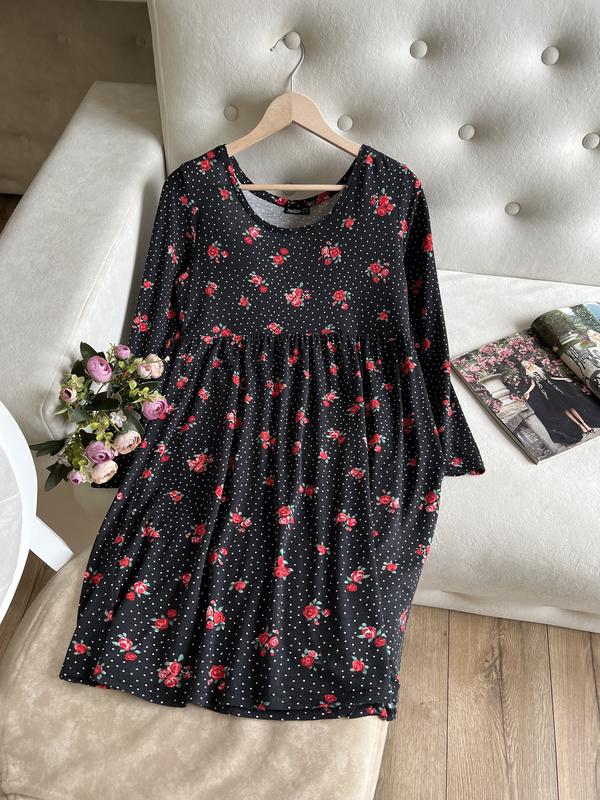 Платье с цветочным принтом черного цвета бренда Janina. Легкая и удобная, ткань приятная к телу. Идеально сидит по фигуре. Размер по набору 40. Замеры: 1/2 ОГ 46-55 1/2 ОТ 42-50 1/2 ОБ 72-82 Длина 89 Плечи 45-53 От плеча до талии 32 На дальней берки срезаны, поэтому состав неведомый.