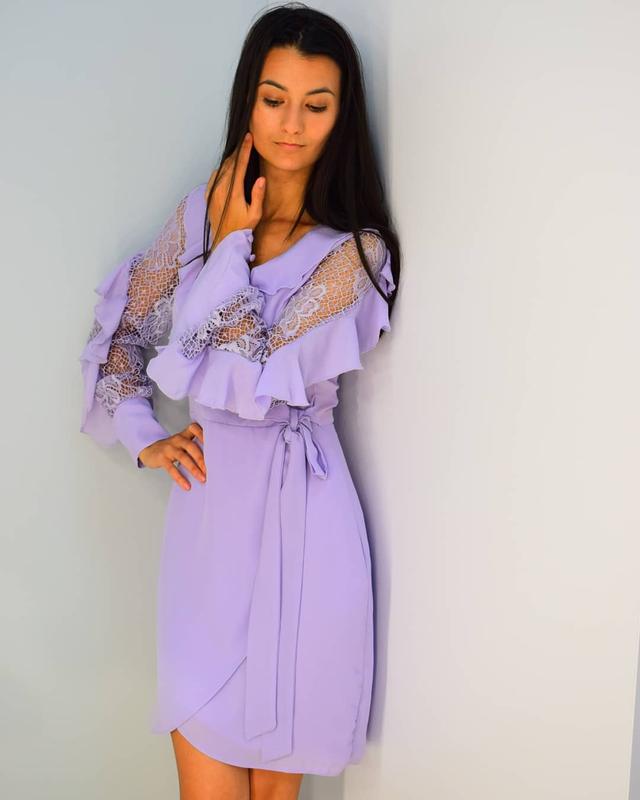 Шифоновое платье мини на запах, имеет V-образный вырез и длинный рукав, декорированное воланами и сетевыми вставками.