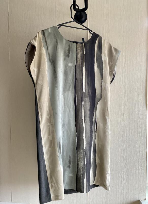 Очень крутое платье от Benetton Лаконичный крой свободного фасона, с очень красивым акцентным принтом. Цвет выглядит стильно и дорого. Сзади платье серого цвета с акцентом в виде молнии Ткань очень приятная, есть подкладка Состояние идеальное, недостатков нет Длина 93 см Полуобхват 49 см