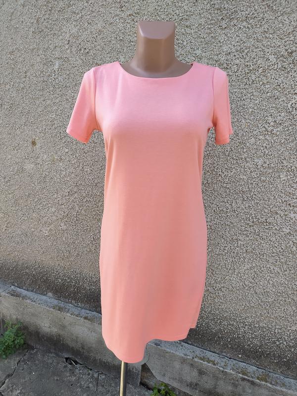 Прямое платье, сзади застегивается на молнию. В реале цвет персиковый. Материал: 79% полиэстер, 18% вискоза, 3% эластан. Размер S. Замеры: ширина в плечах 35см, пог 46см, пот 43см, пос 46см, длина 82см.